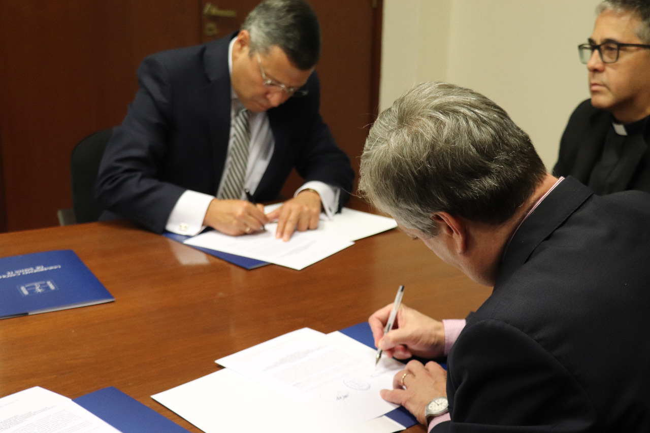 Lors d’une importante cérémonie présidée par le Recteur de l’Université, M. Eugenio Martín de Palma, l’accord a été signé entre l’UCSF et l’OMAEC, en présence du Dr. Fabián Jerkovich, Directeur du Secrétariat de la Formation Permanente de l’OMAEC, du Père Ernesto Aguera, Vice-Chancelier de l’UCSF, du Père Carlos Scatizza, Vice-Recteur de la Formation de l’UCSF et du Président de l’UNAEC Amérique. Le Conseil Exécutif de l’OMAEC s’est également joint virtuellement à l’événement.